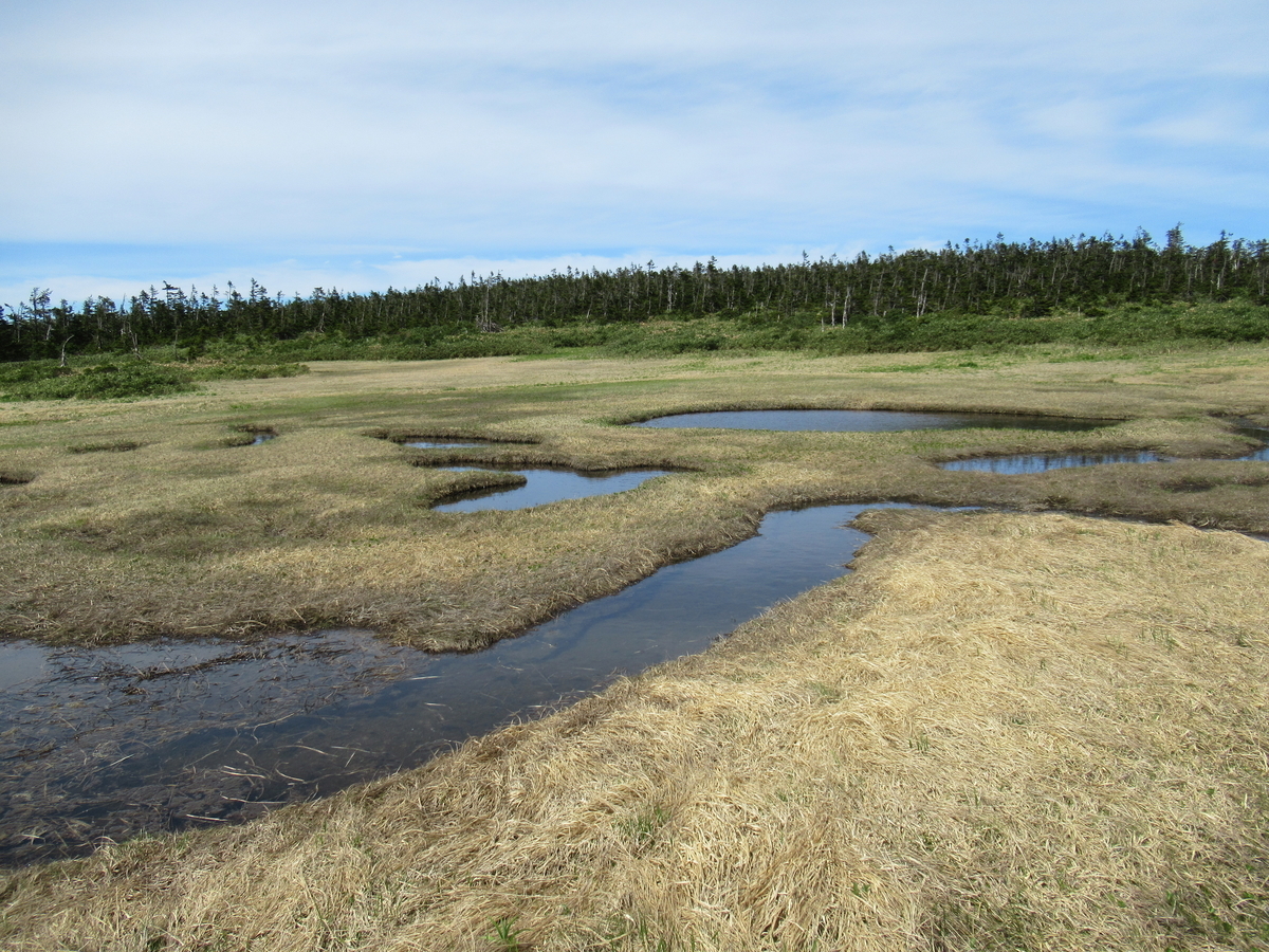 斜面の上の方にある雪のかたまりから少しずつ水がしみだしているのでしょう。湿原