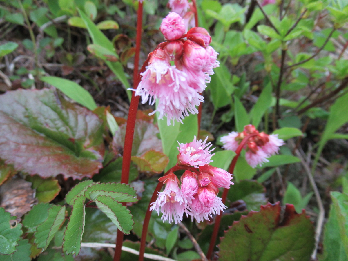 霧で何も見えませんが、バス停の向こう側にはこのイワカガミが群生しています。バ