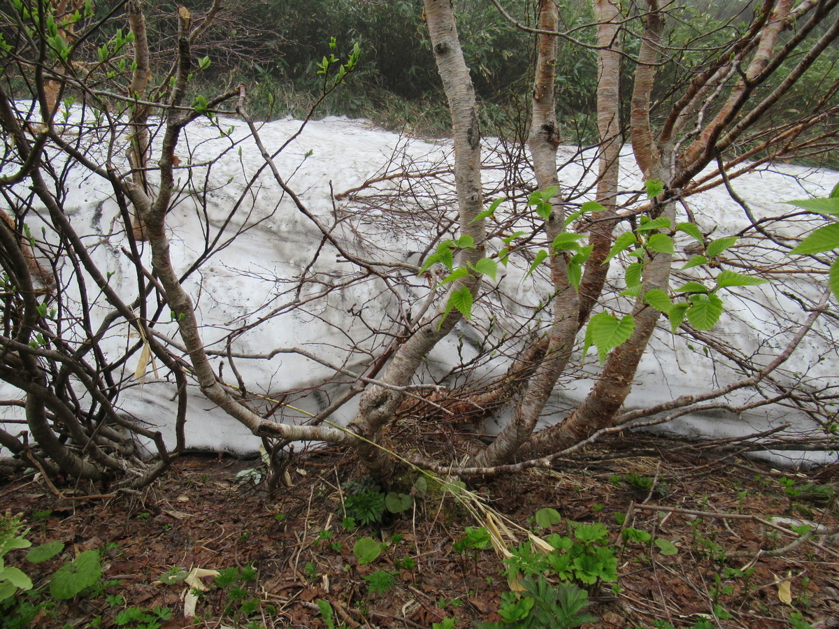 雪が大きな塊になってずいぶんと残っているのを見ました。ダケカンバが雪の重さで